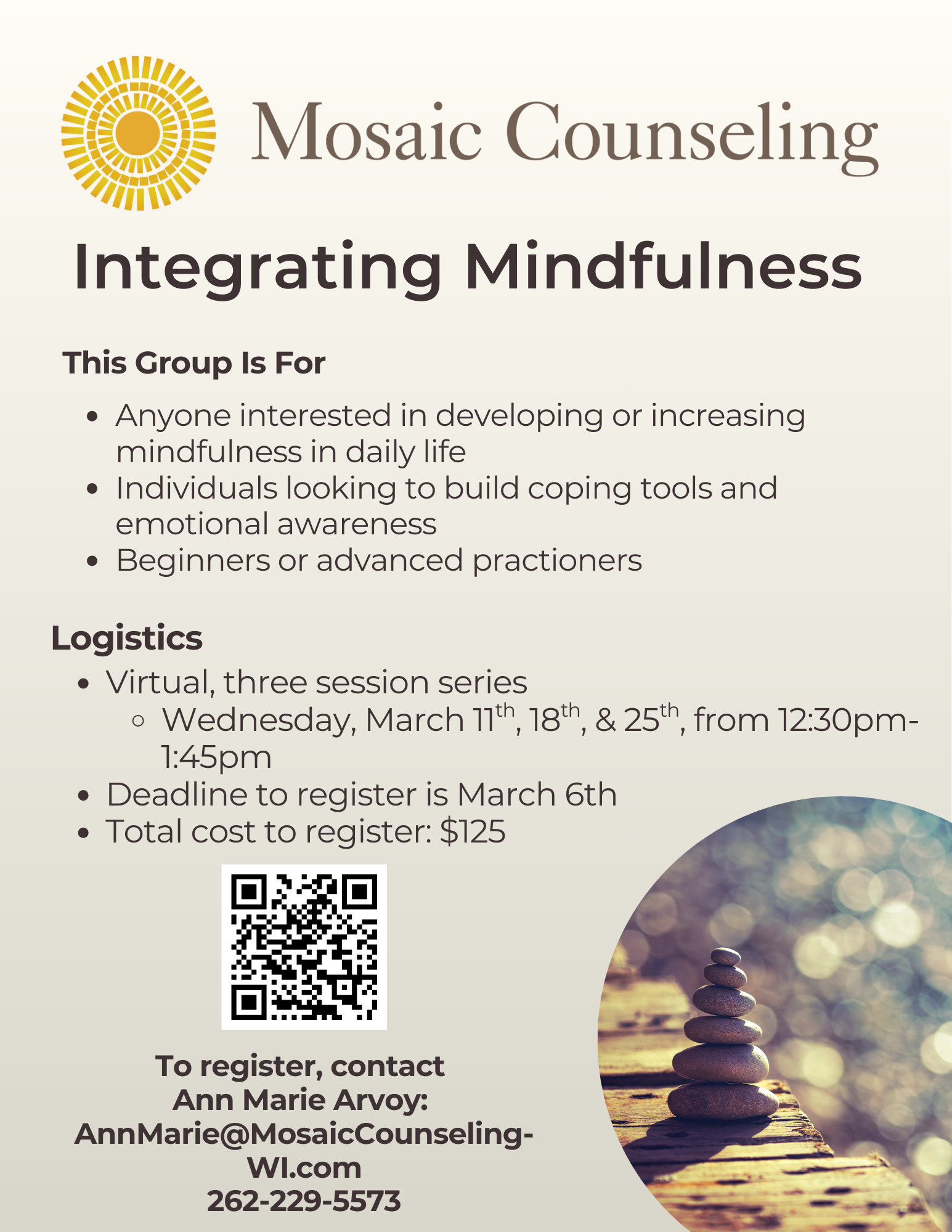 To Sign Up: Contact Ann Marie Arvoy at 262-229-5573 or e-mail AnnMarie@MosaicCounseling-WI.com